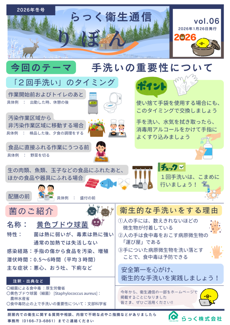 らっく衛生通信 りぼん 2026年冬号コラム2026.02.042026.01.26厳しい寒さが続いておりますが、お変わりございませんでしょうかこの度、管理栄養士より食品衛生についてを中心に、情報発信することになりました日々の業務に役立ちますと幸いです今年も幸多き年でありますよう、お祈り申し上げます