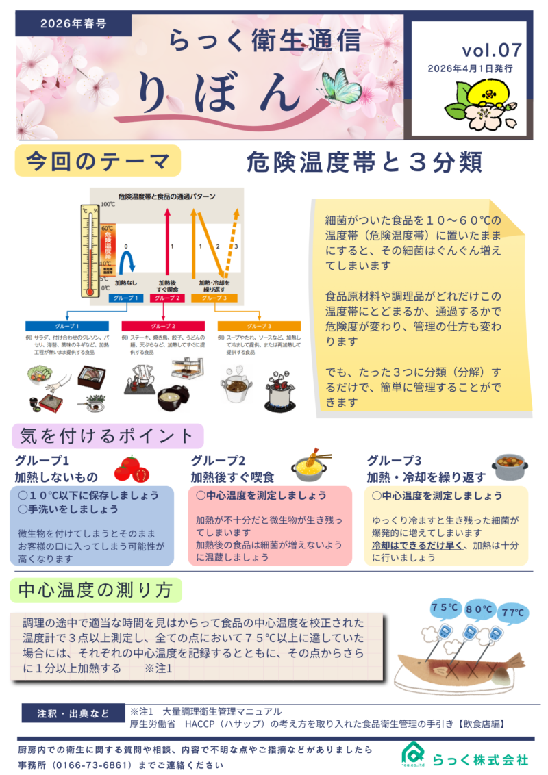 らっく衛生通信 りぼん 2026年春号コラム2026.04.01陽春の候、桜の花も咲きそろい、心躍る頃となりました。春号では、「危険温度帯」を中心に食中毒の防止についてお知らせいたします。花の便りに心弾む頃、皆さまのますますのご発展をお祈りいたします。